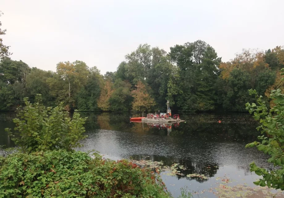 Installée provisoirement sur la Vienne, une barge flottante (type barge ostréicole) de huit mètres de long, équipée d’un orifice central, accueille une foreuse chargée de prélever des échantillons du lit de la rivière (carottage).